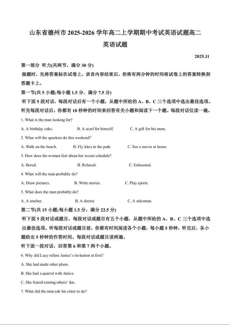 山东省德州市2025-2026学年高二上学期期中考试 英语试题(含答案).docx