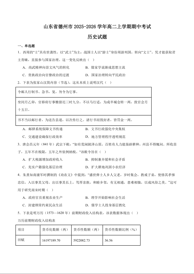 山东省德州市2025-2026学年高二上学期期中考试 历史试题(含答案).docx