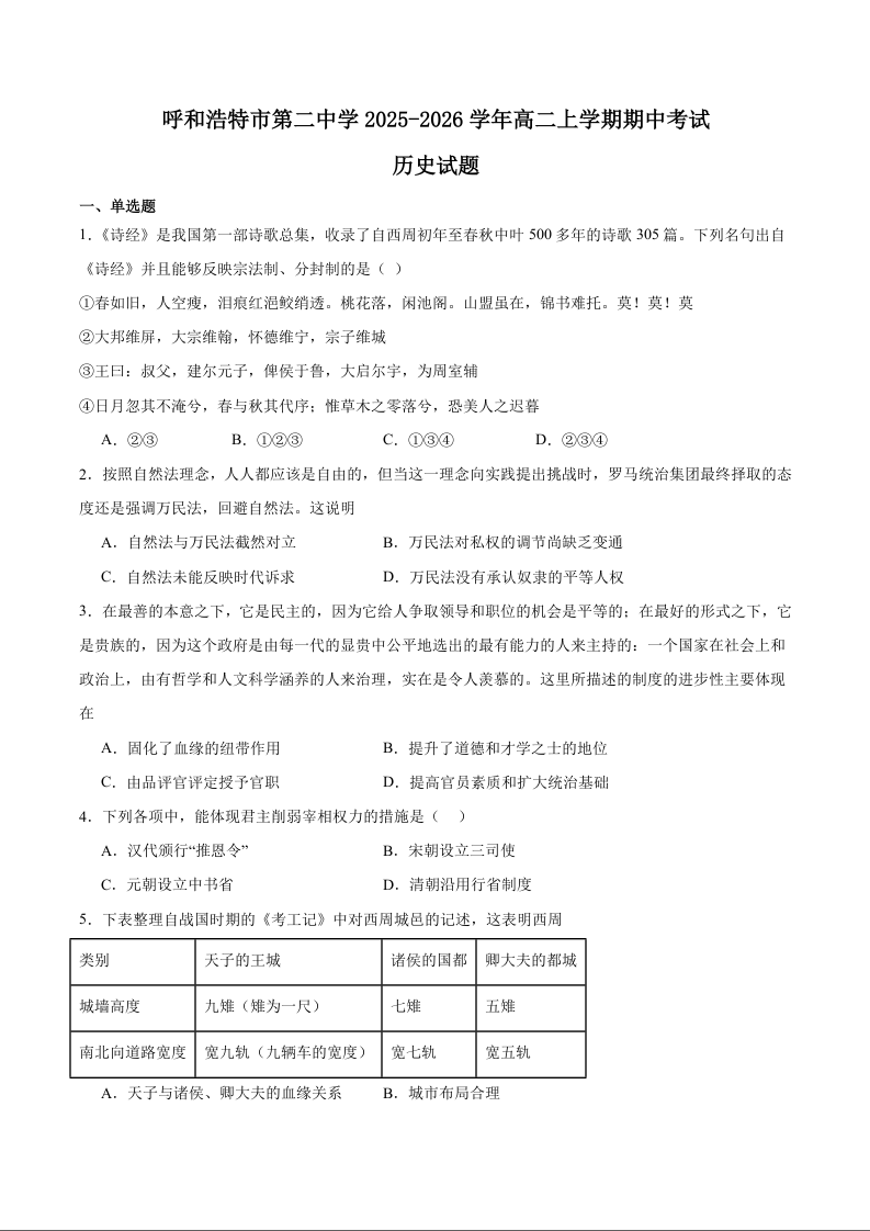 呼和浩特市第二中学2025-2026学年高二上学期期中考试 历史试卷(含答案).docx