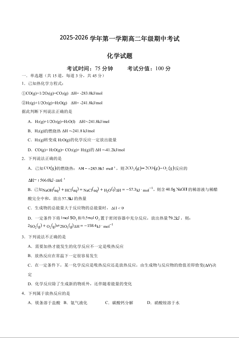 呼和浩特市第二中学2025-2026学年高二上学期期中考试 化学试卷(含答案).docx