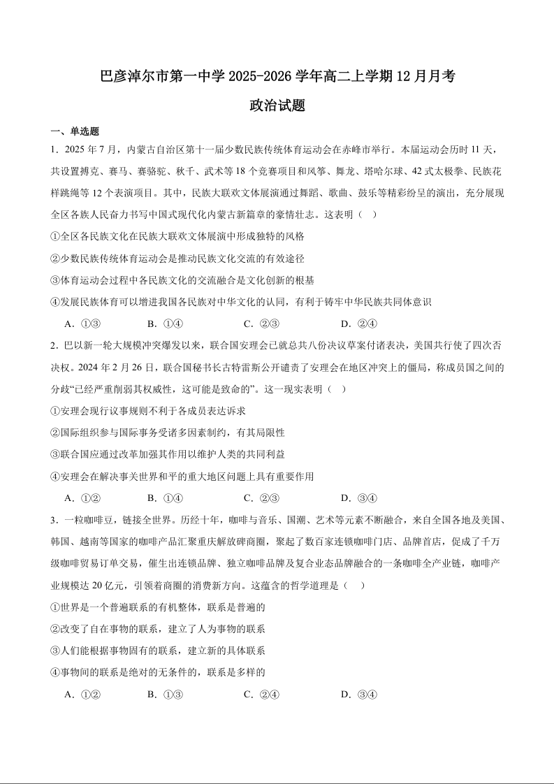 内蒙古巴彦淖尔市第一中学2025-2026学年高二上学期12月月考 政治试题(含答案).docx
