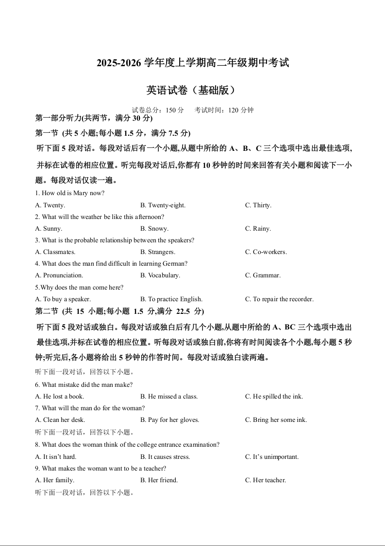 江西省上饶市2025-2026学年高二上学期期中考试 英语试题(含答案).docx