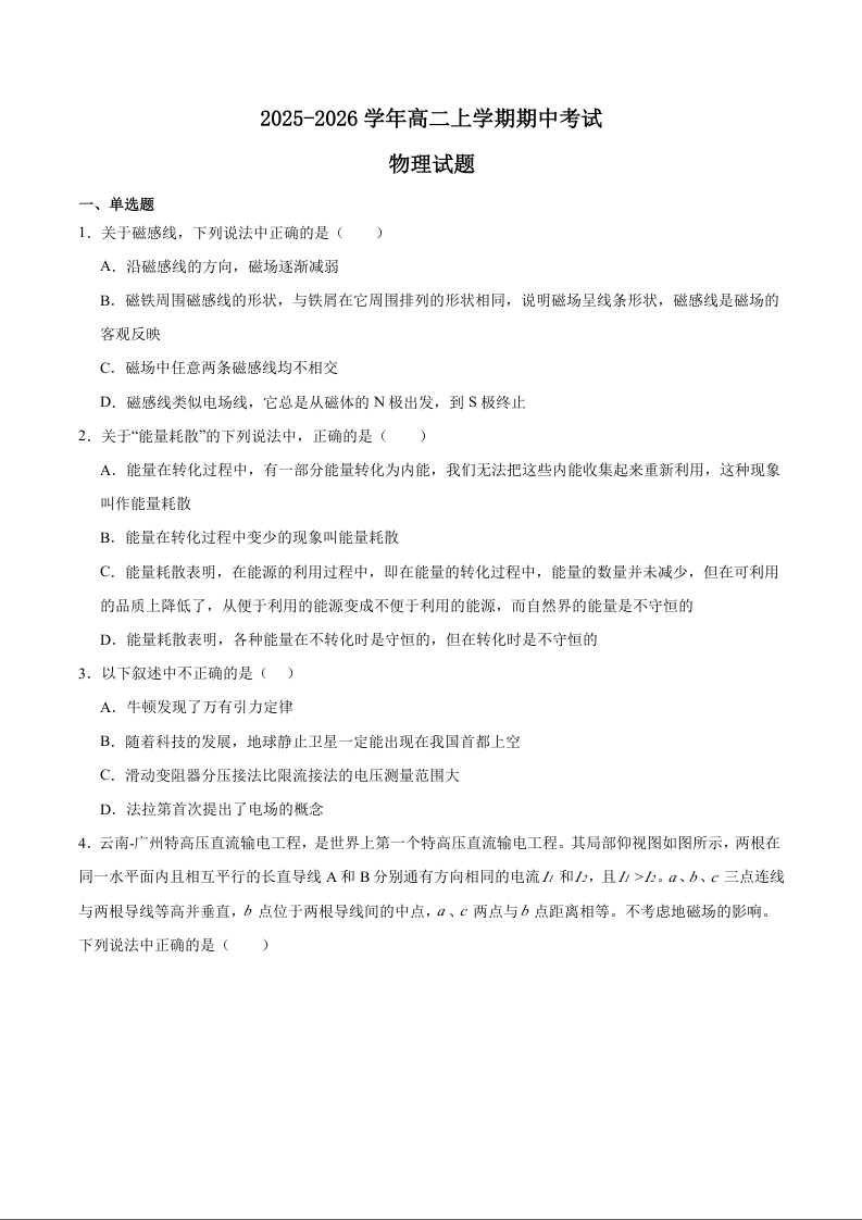 江西省上饶市2025-2026学年高二上学期期中考试 物理试题(含答案).docx
