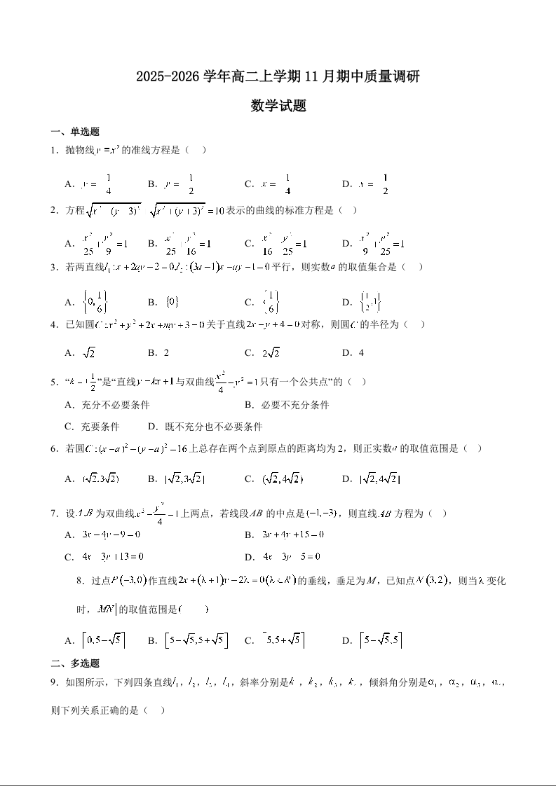 江苏省常州高级中学2025-2026学年高二上学期期中考试 数学试题(含答案).docx