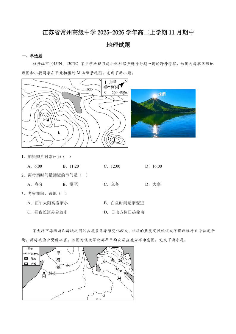 江苏省常州高级中学2025-2026学年高二上学期期中考试 地理试题(含答案).docx