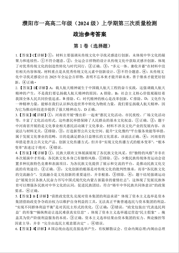 濮阳市一高2024级高二上学期第三次质量检测 政治答案.docx