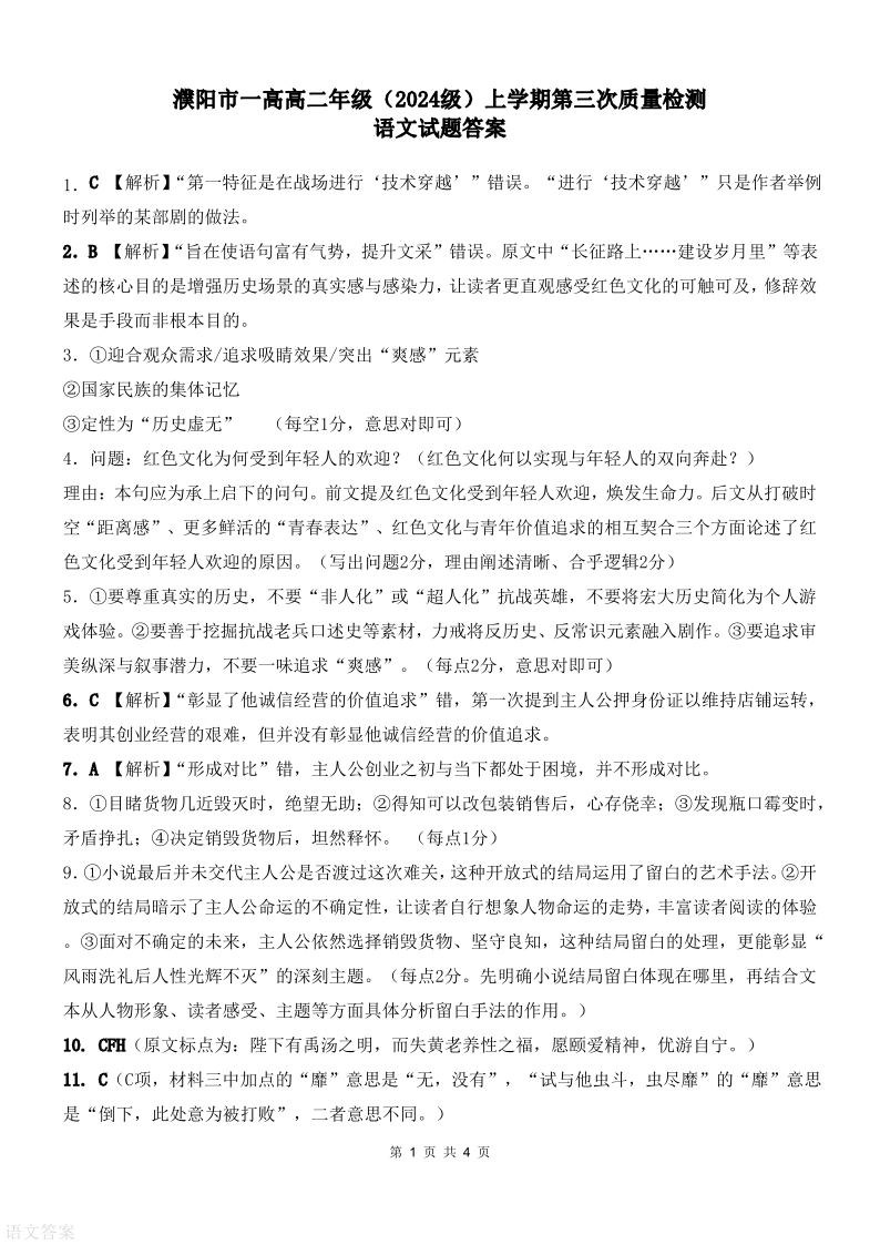 濮阳市一高2024级高二上学期第三次质量检测 语文答案.pdf