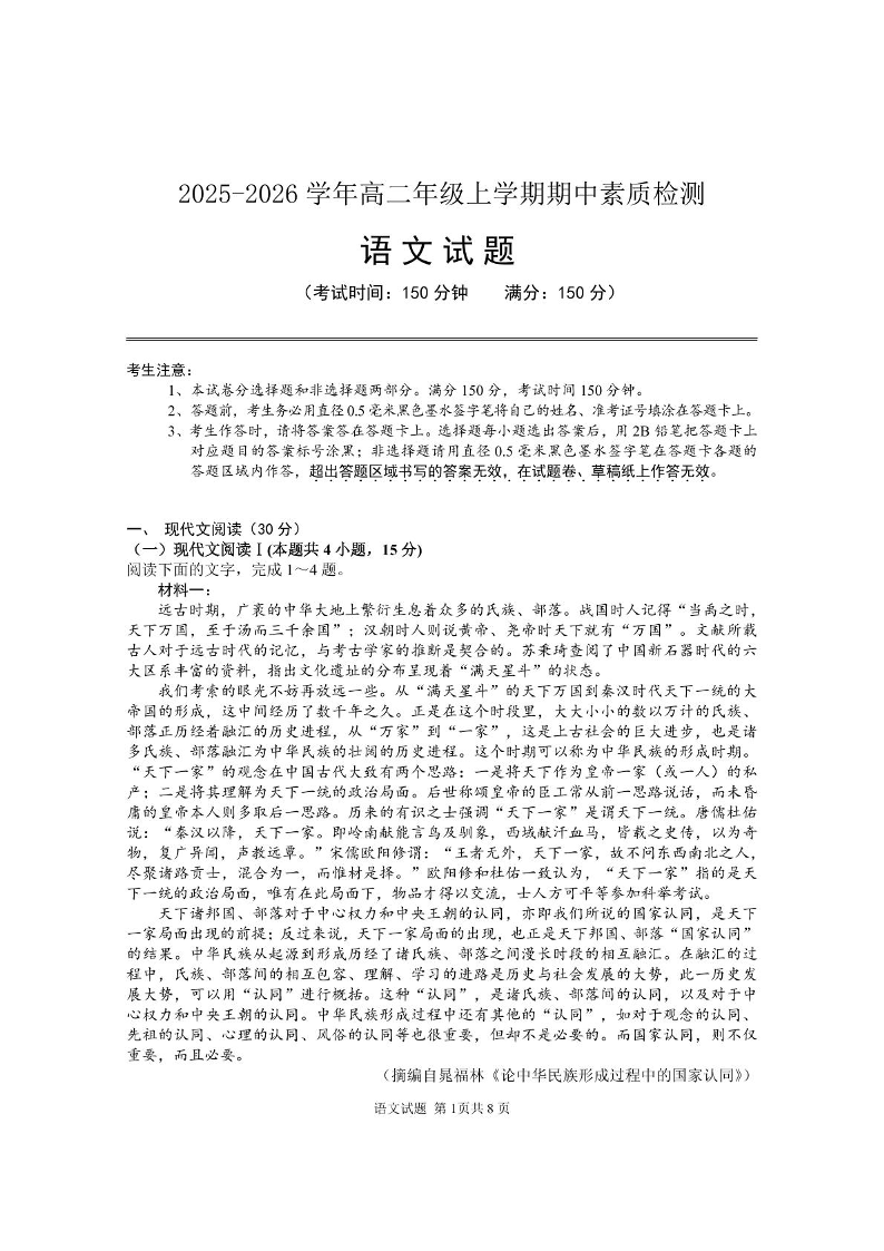 安徽师范大学附属中学2025-2026学年高二上学期期中考试 语文试题(含答案).pdf