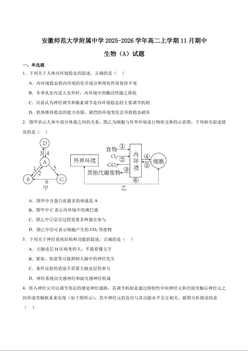 安徽师范大学附属中学2025-2026学年高二上学期期中考试 生物试题(含答案).docx