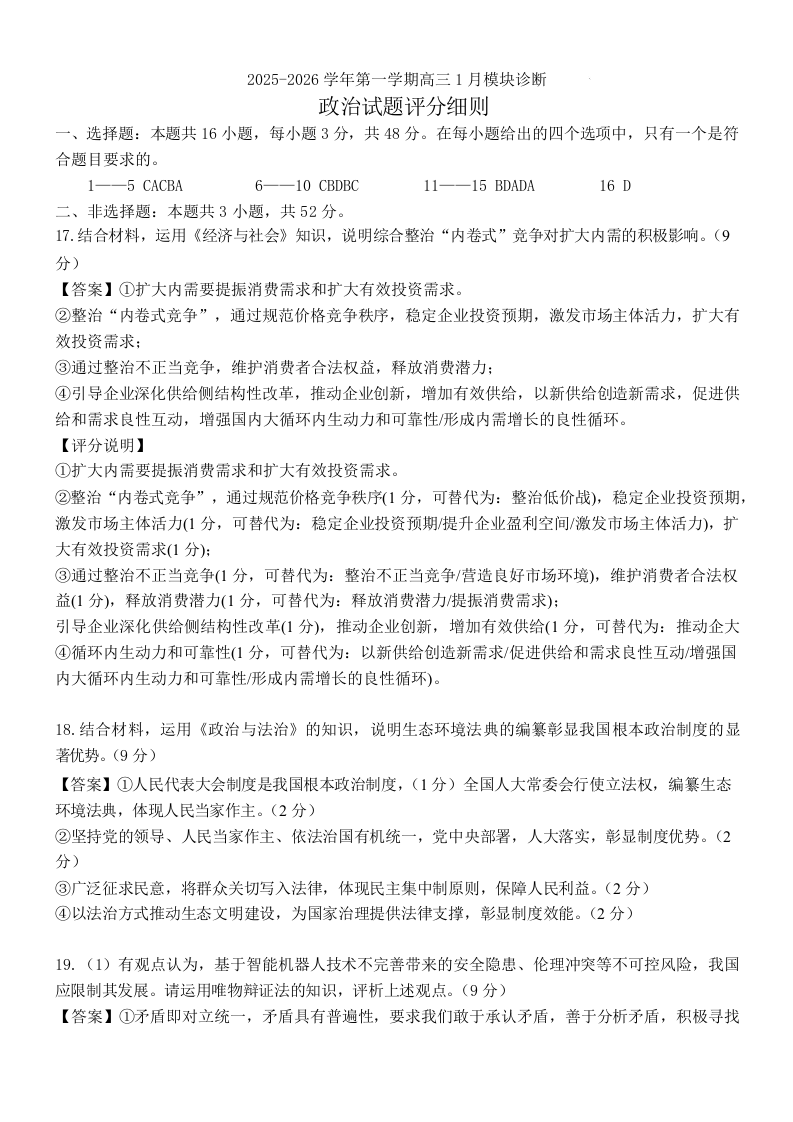 山西大学附中2025-2026学年第一学期高三1月模块诊断 政治答案.docx