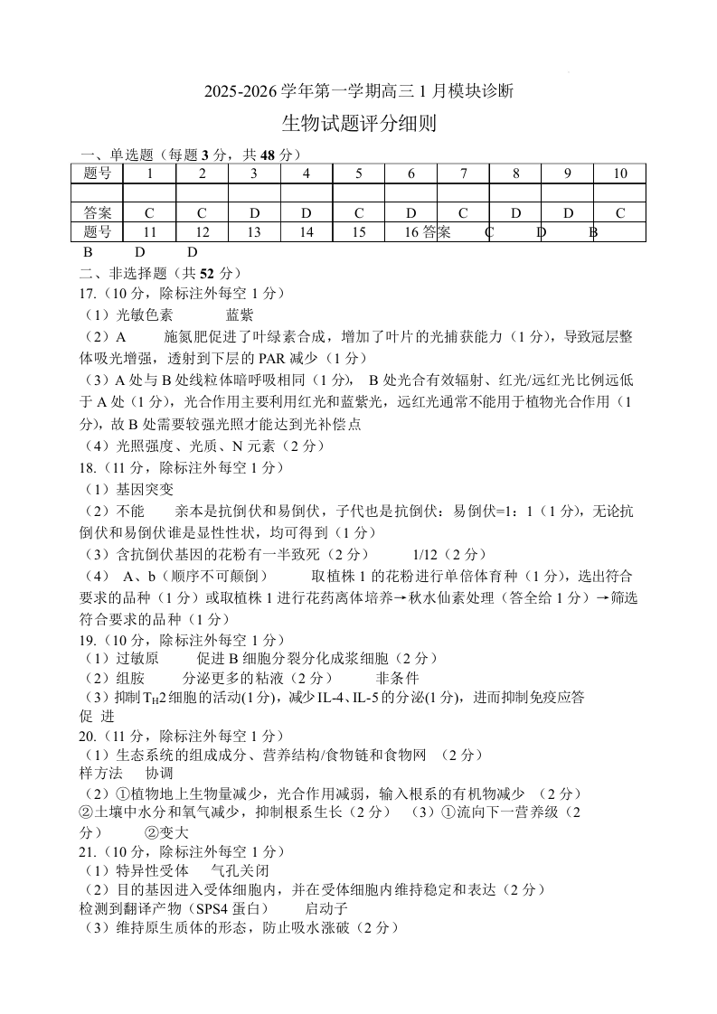 山西大学附中2025-2026学年第一学期高三1月模块诊断 生物答案.docx
