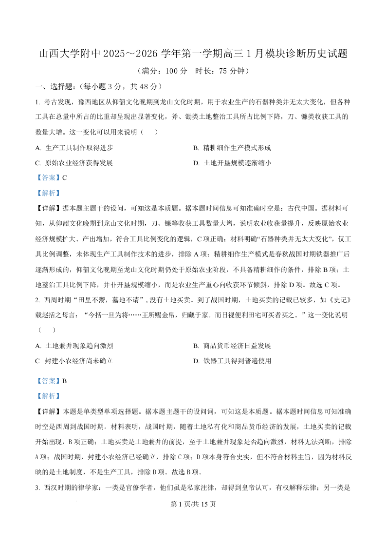 山西大学附中2025-2026学年第一学期高三1月模块诊断 历史答案.docx