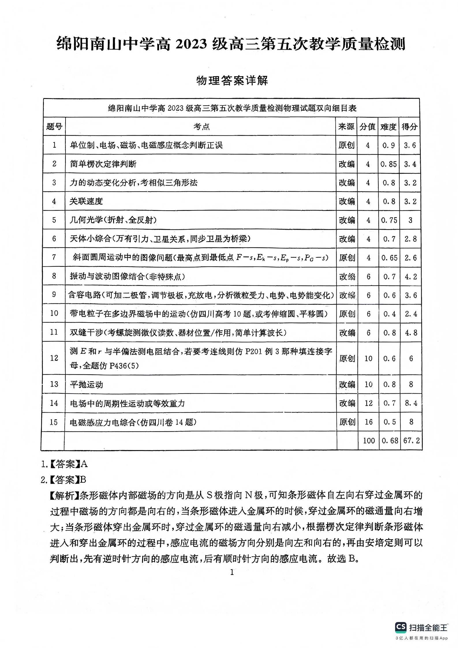 绵阳南山中学高2023级高三第五次教学质量检测 物理答案.pdf