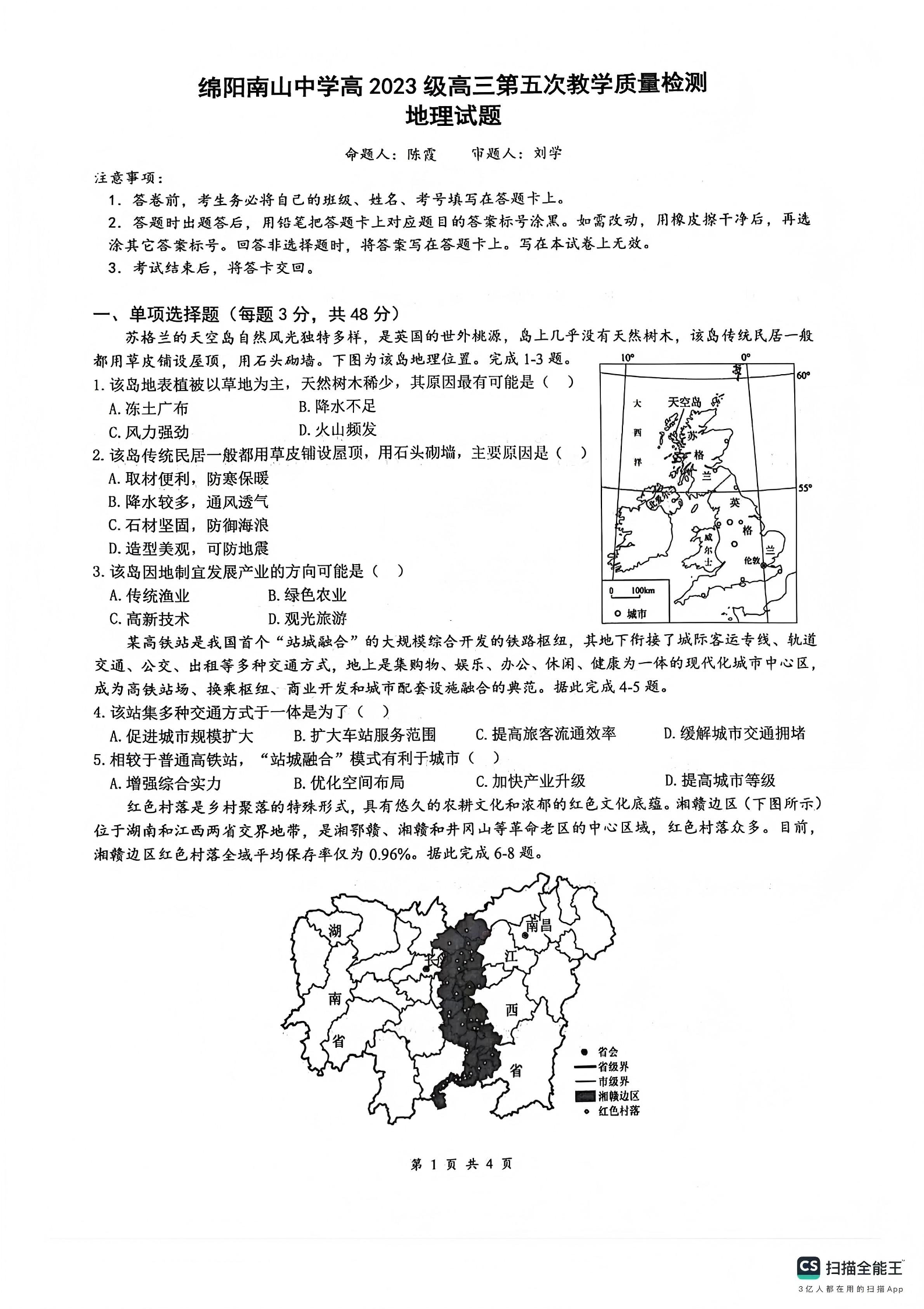 绵阳南山中学高2023级高三第五次教学质量检测 地理.pdf