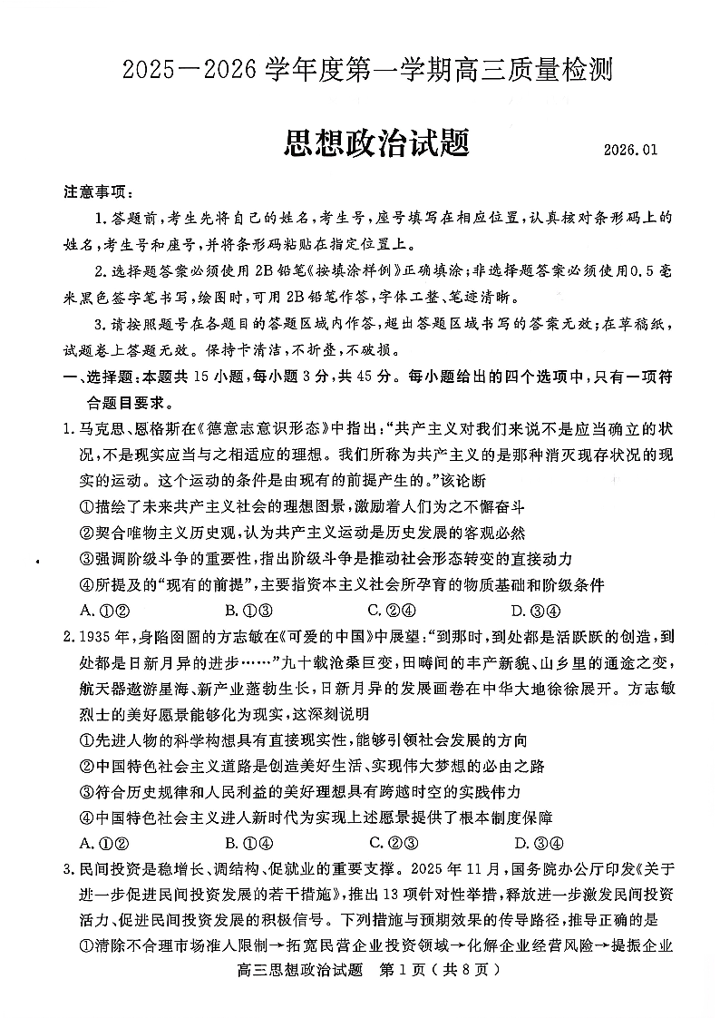 2025一2026学年度第一学期高三质量检测 政治试题(含答案).pdf