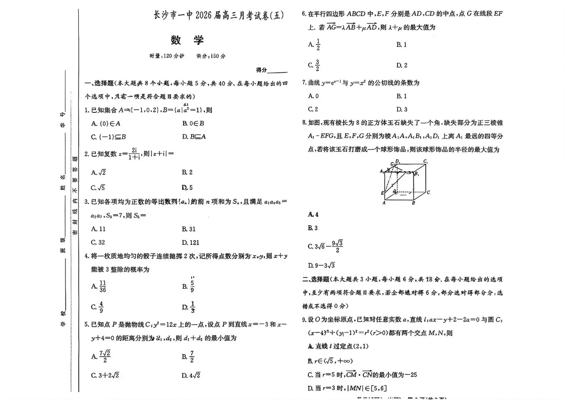长沙市一中2026届高三月考试卷(五)数学.pdf