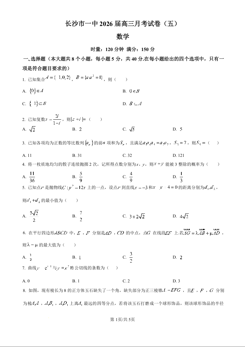 长沙市一中2026届高三月考试卷(五)数学.docx