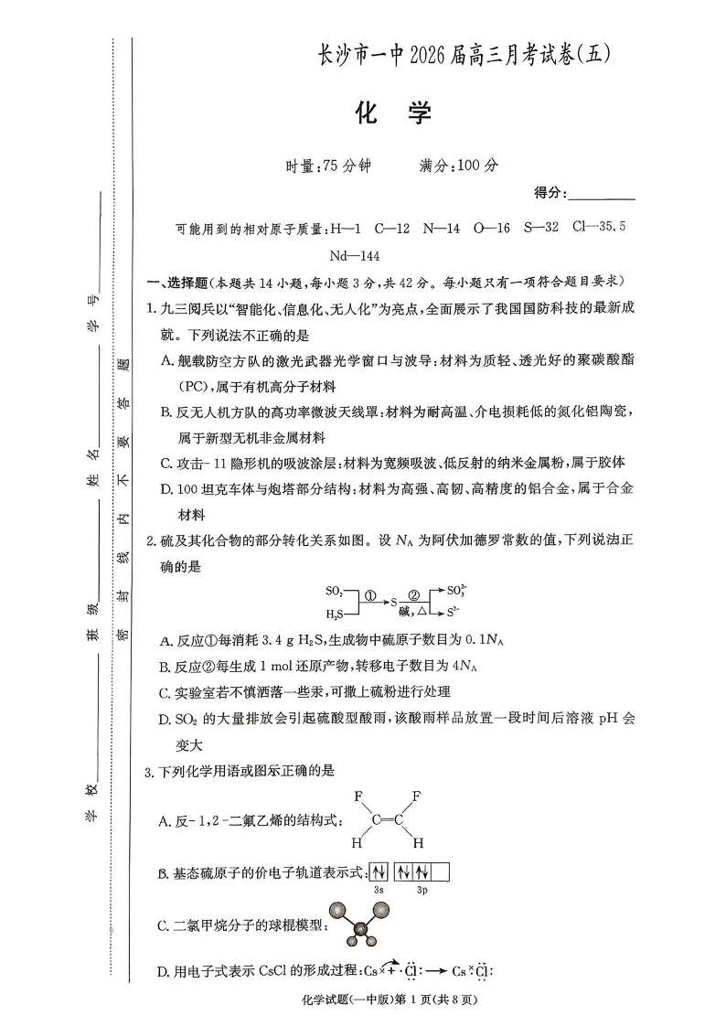 长沙市一中2026届高三月考试卷(五)化学.pdf