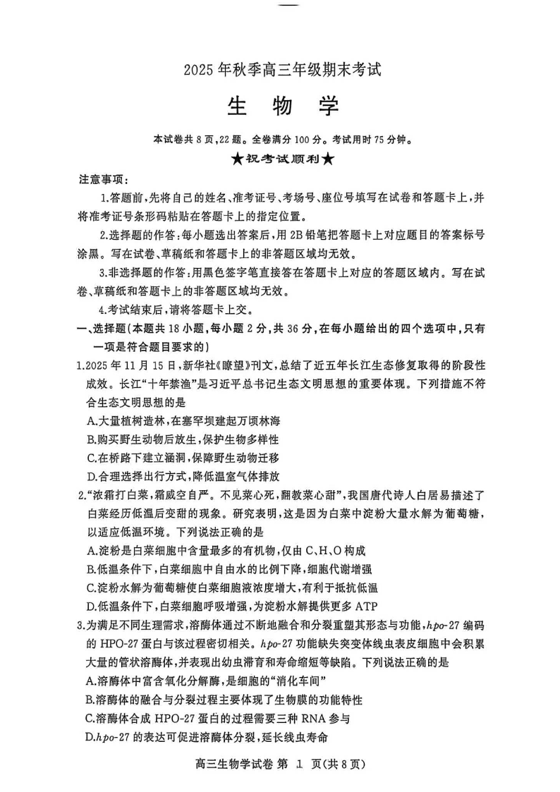 黄冈市2025年秋季高三年级1月期末考试 生物.pdf