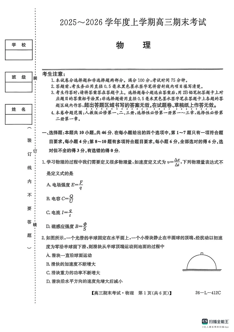 齐齐哈尔市2025~2026学年度上学期高三期末考试 物理.pdf