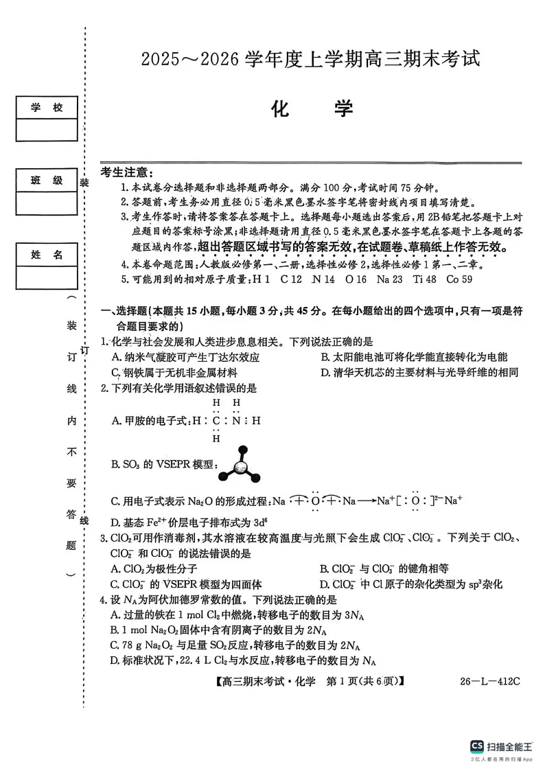 齐齐哈尔市2025~2026学年度上学期高三期末考试 化学.pdf