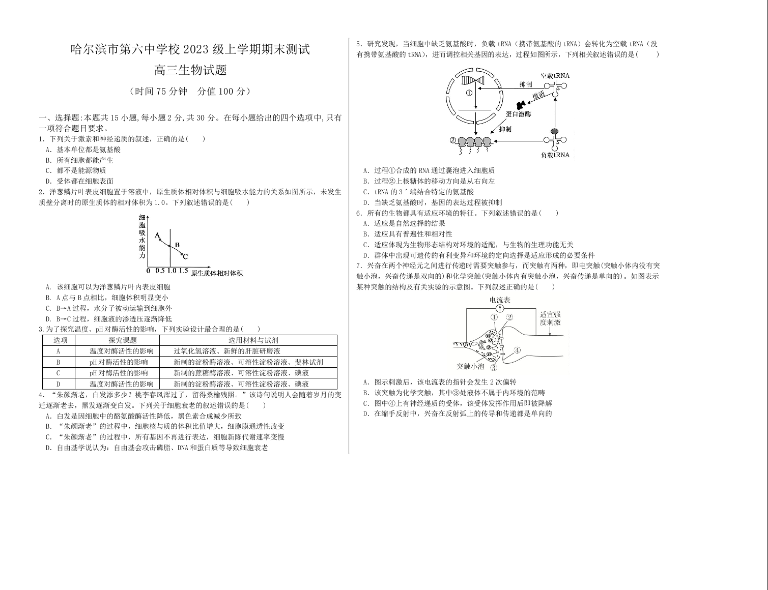 哈尔滨市第六中学2026届高三上学期期末测试 生物.docx