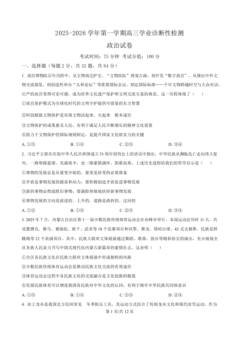 内蒙古鄂尔多斯市第一中学2026届高三上学期1月月考 政治.docx