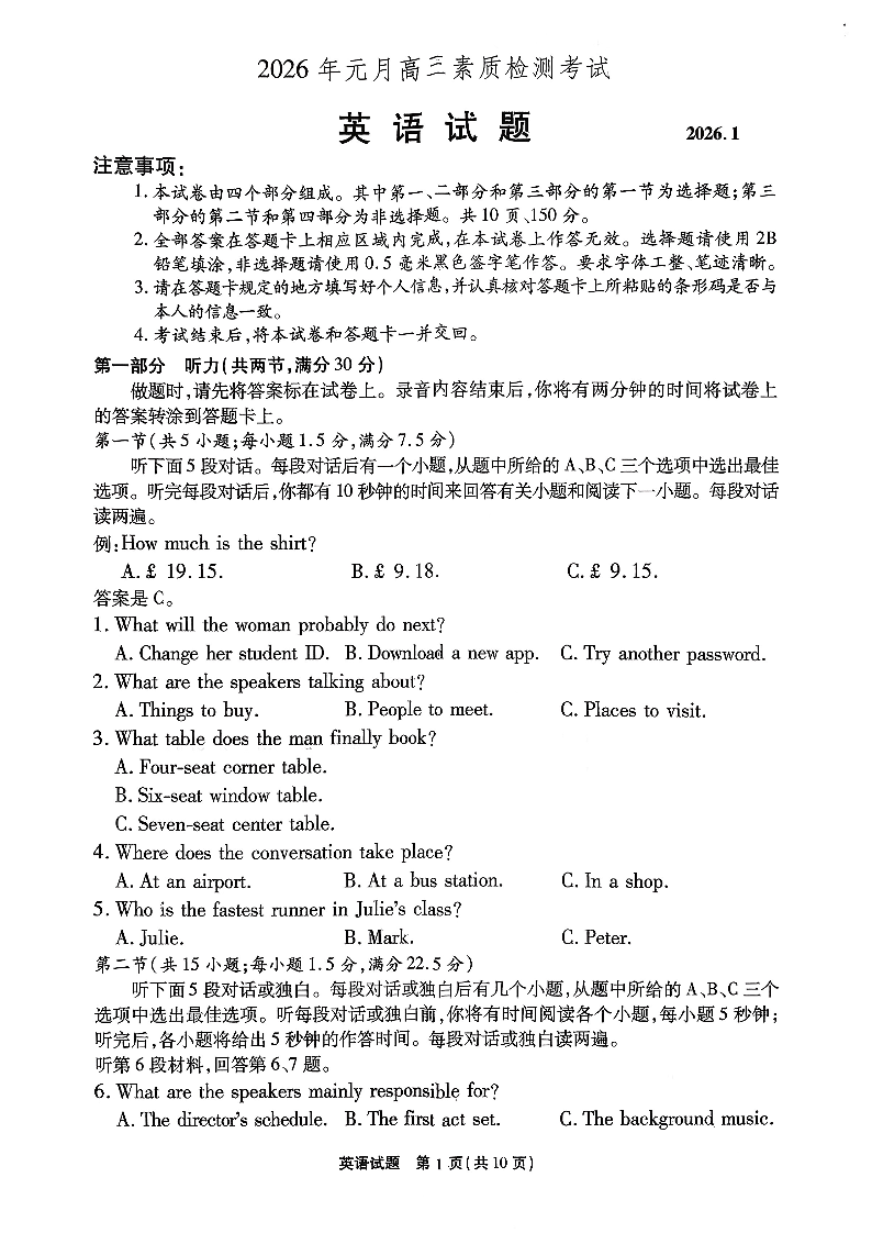 安徽省六校2026年元月高三素质检测考试 英语