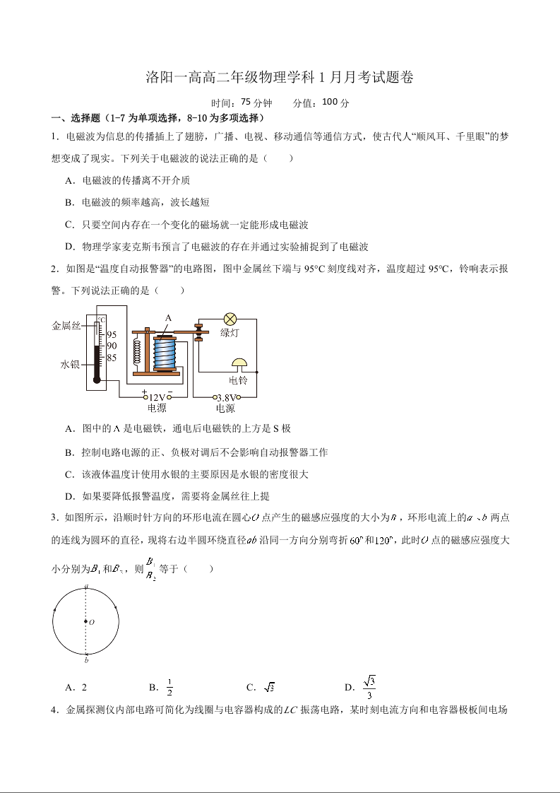 河南省洛阳市第一高级中学2025-2026学年高二上学期1月月考 物理试卷(含答案).docx