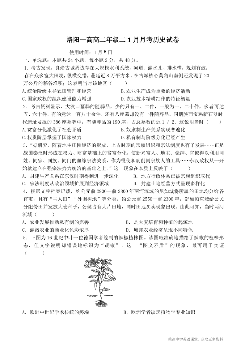河南省洛阳市第一高级中学2025-2026学年高二上学期1月月考 历史试卷(含答案).docx