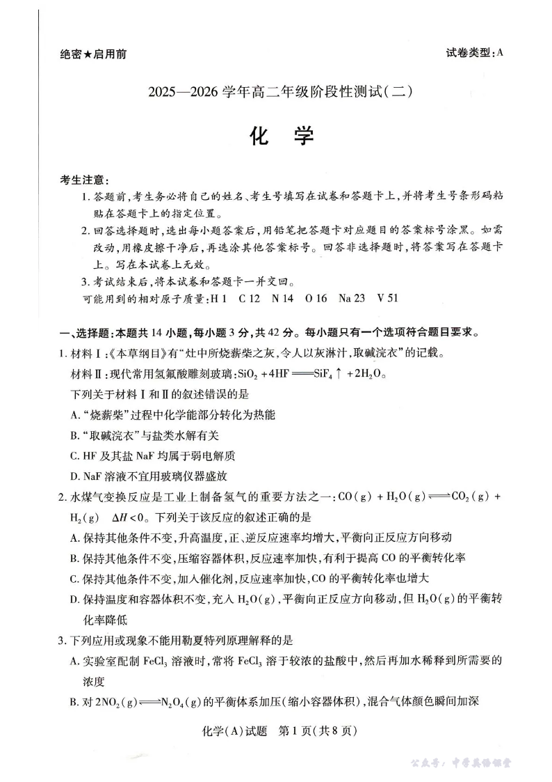 河南省豫北名校2025-2026学年高二年级1月阶段性测试(二)化学试题(含答案).pdf