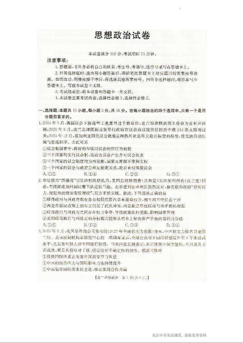 辽宁省抚顺市六校协作体2025-2026学年度高二上学期期末联考 政治.docx