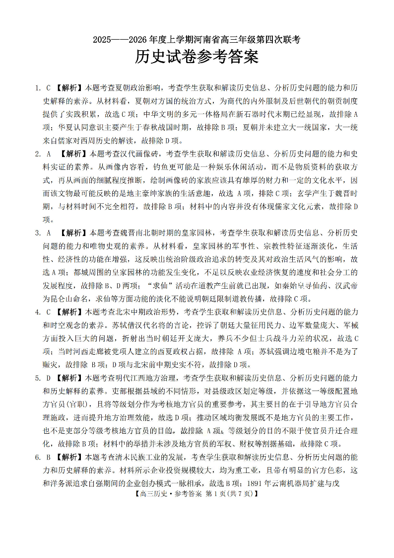河南省2025—2026年度上学期高三年级第四次联考 历史答案.pdf
