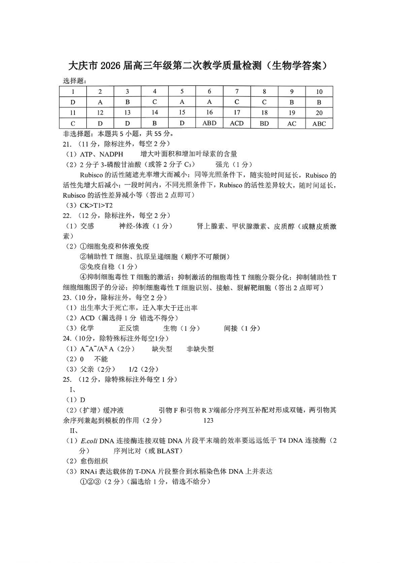 大庆市2026届高三年级第二次教学质量检测 生物答案.pdf