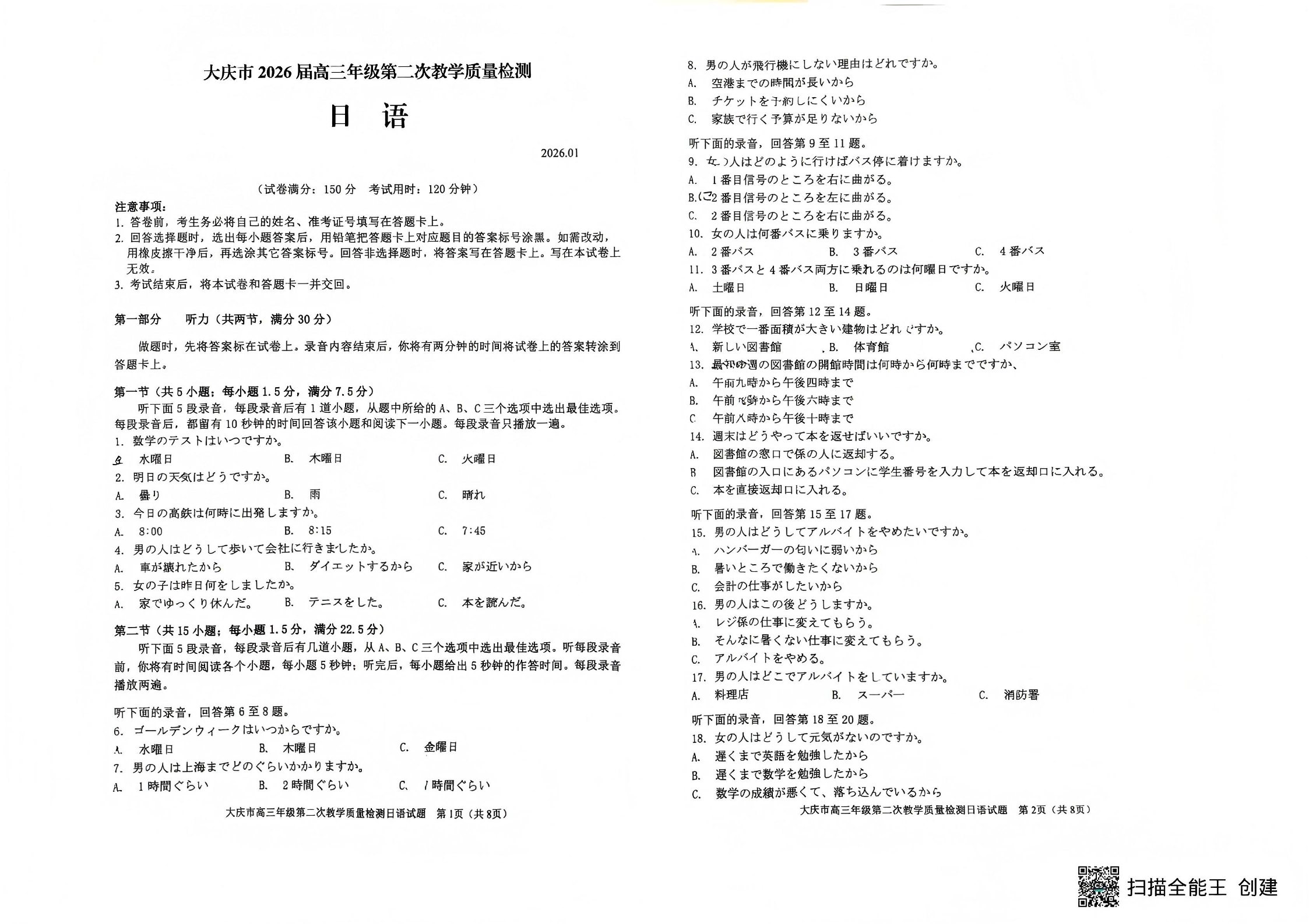大庆市2026届高三年级第二次教学质量检测 日语.pdf