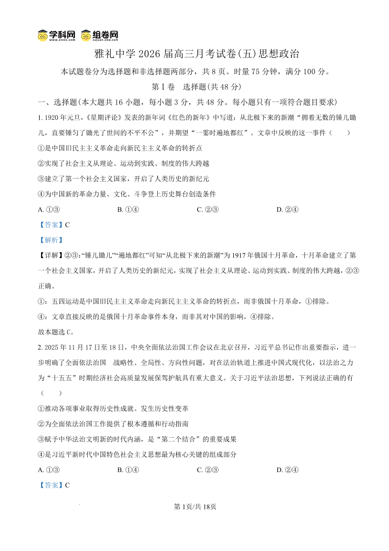 雅礼中学2026届高三月考试卷(五)政治答案.pdf