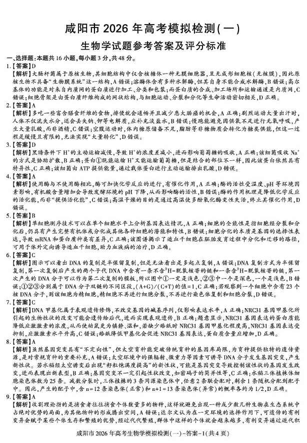 咸阳市2026年高考模拟检测(一)生物答案.pdf