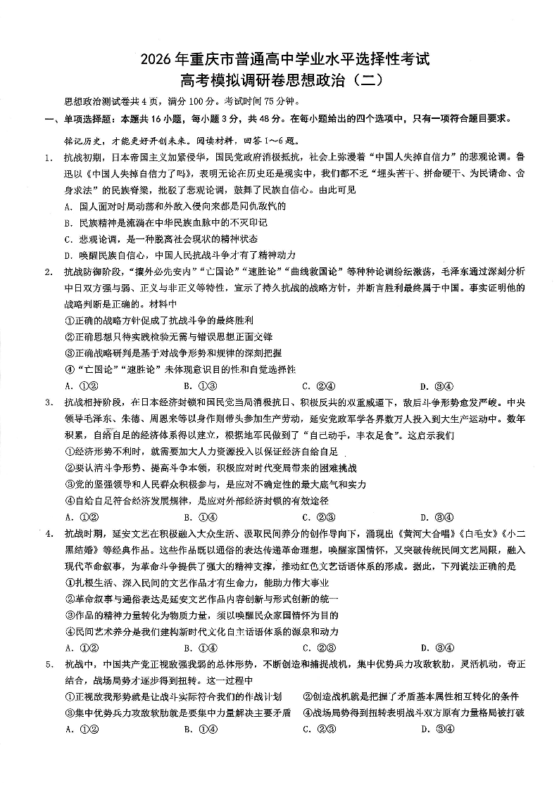 2026年重庆市普通高中学业水平选择性考试高考模拟调研卷(二)政治试题(含答案).pdf
