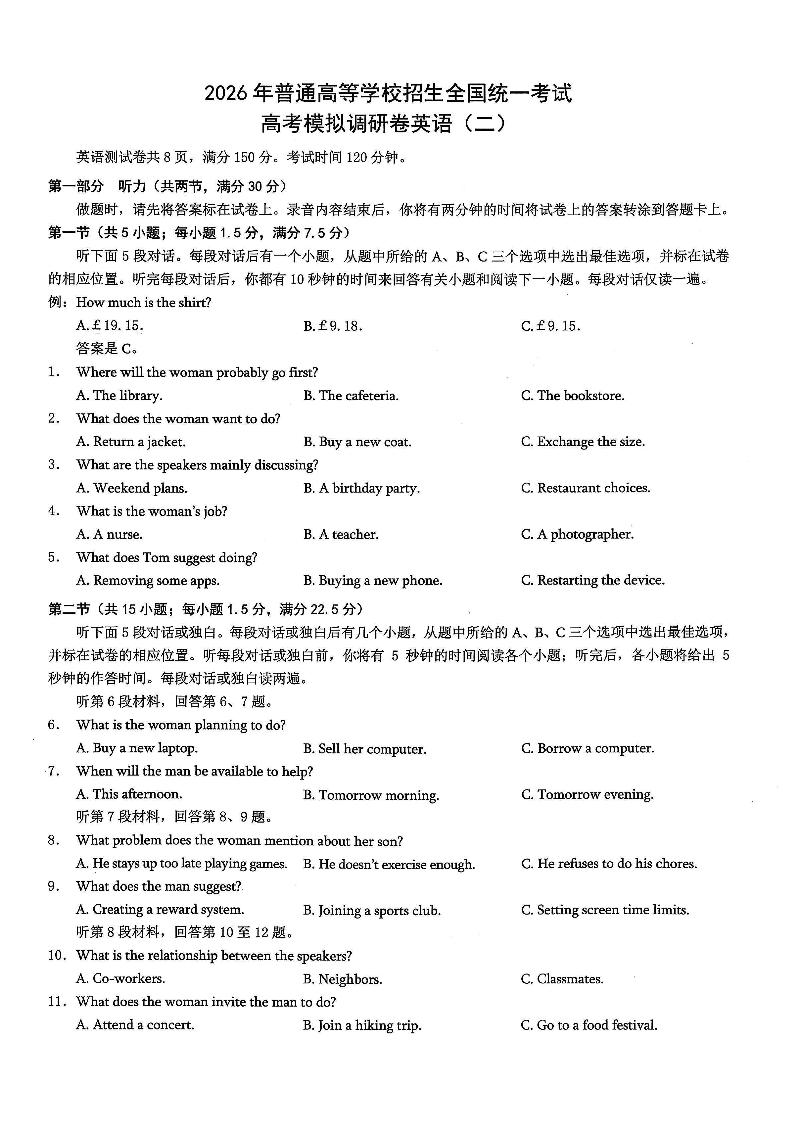 2026年重庆市普通高中学业水平选择性考试高考模拟调研卷(二)英语试题(含答案).pdf