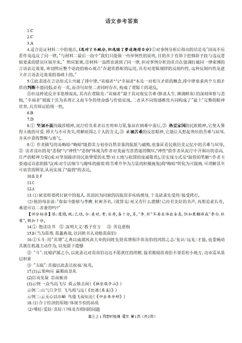 重庆西南大学附属中学高2026届高三1月定时检测(一诊)语文答案.pdf