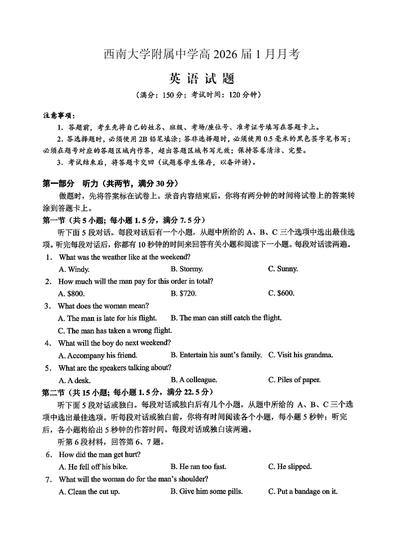 重庆西南大学附属中学高2026届高三1月定时检测(一诊)英语.pdf