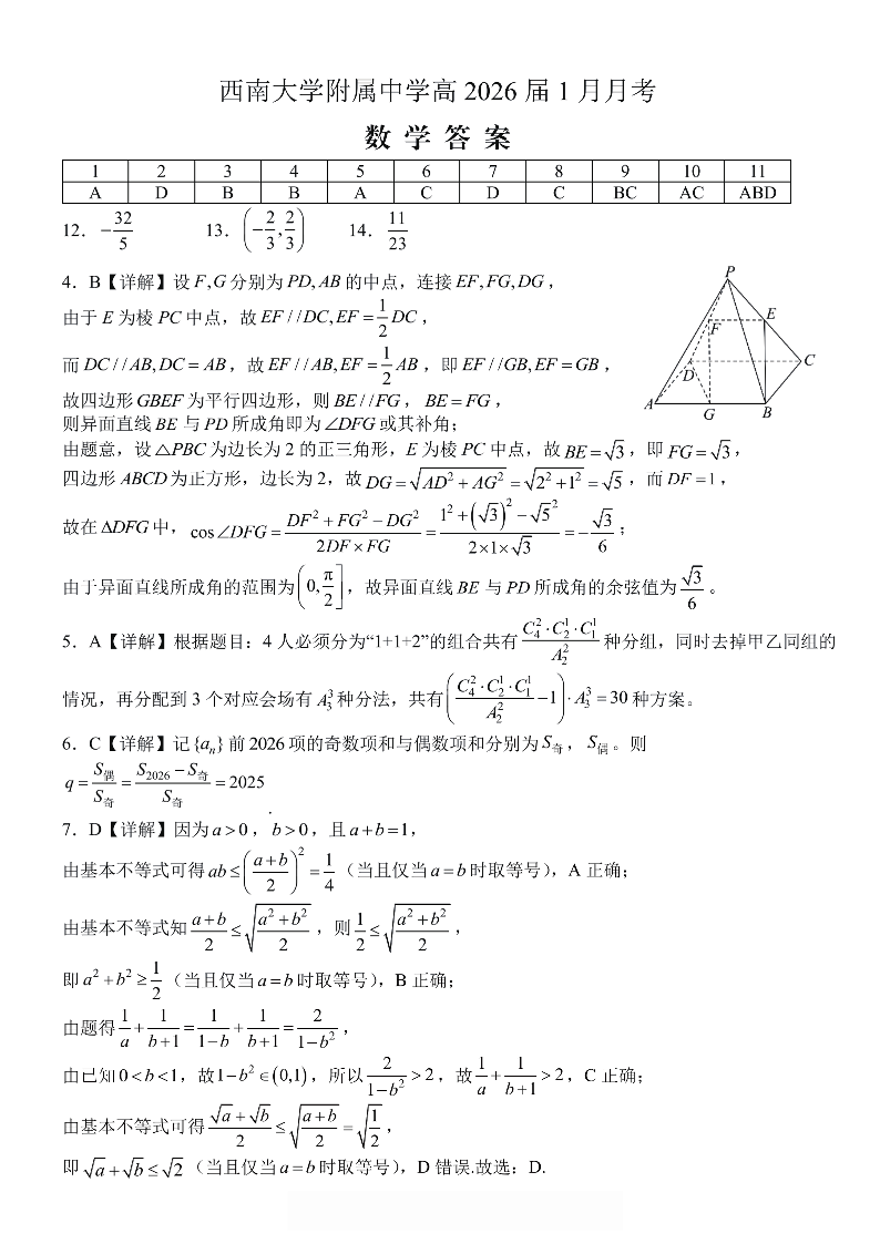 重庆西南大学附属中学高2026届高三1月定时检测(一诊)数学答案.pdf