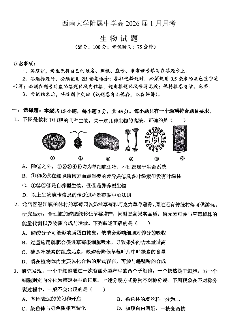 重庆西南大学附属中学高2026届高三1月定时检测(一诊)生物.pdf