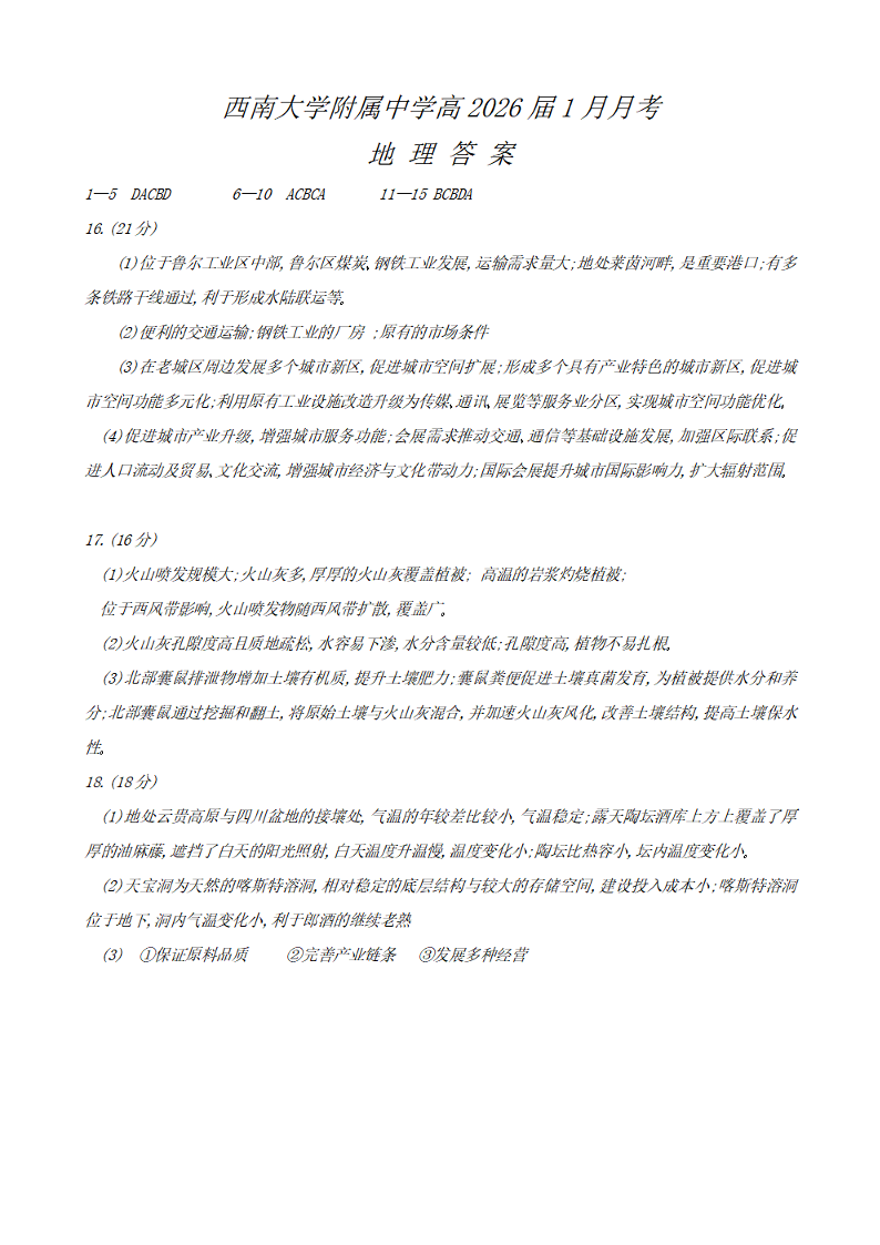 重庆西南大学附属中学高2026届高三1月定时检测(一诊)地理答案.pdf