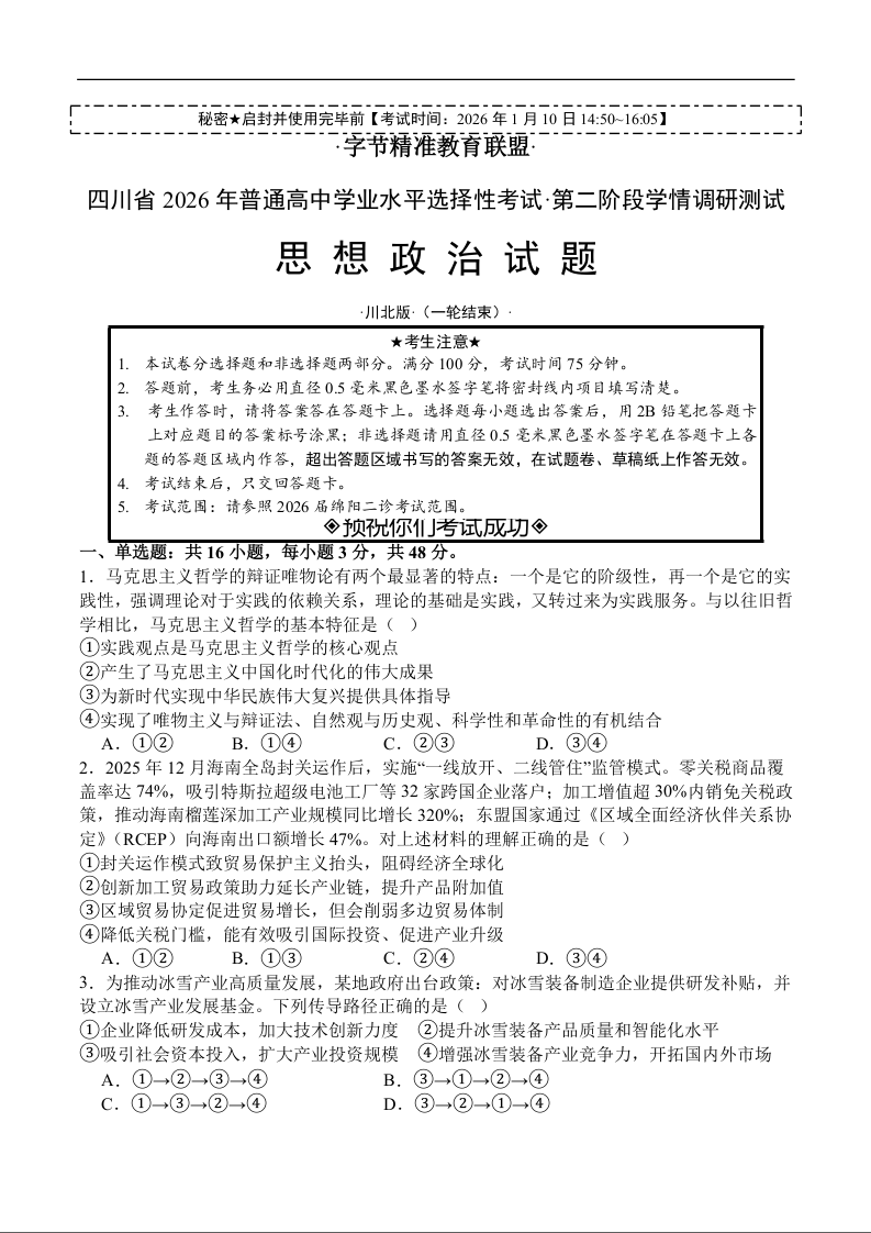 字节精准教育联盟2026届高三上学期第二阶段学情调研测试 政治试题(含答案).docx