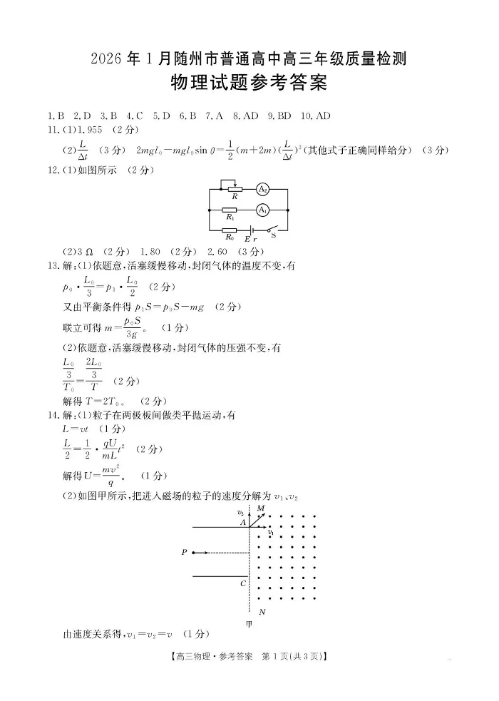 2026年1月随州市普通高中高三年级质量检测 物理答案.pdf