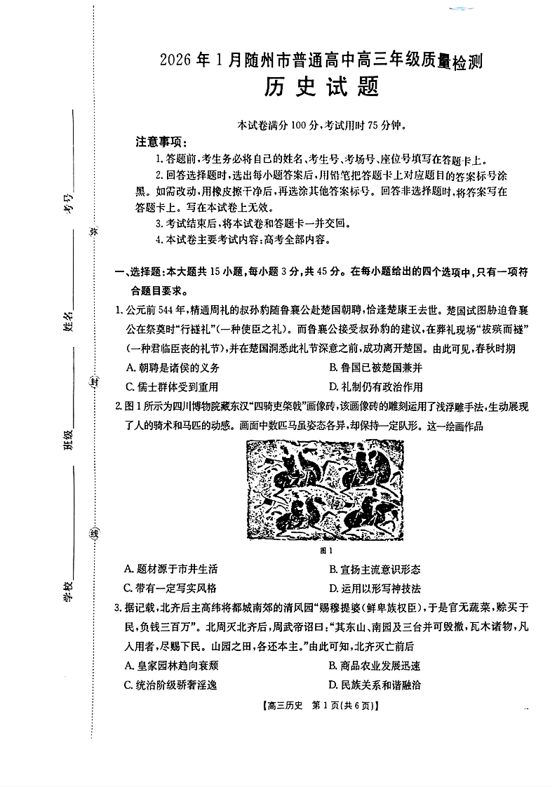 2026年1月随州市普通高中高三年级质量检测 历史.pdf