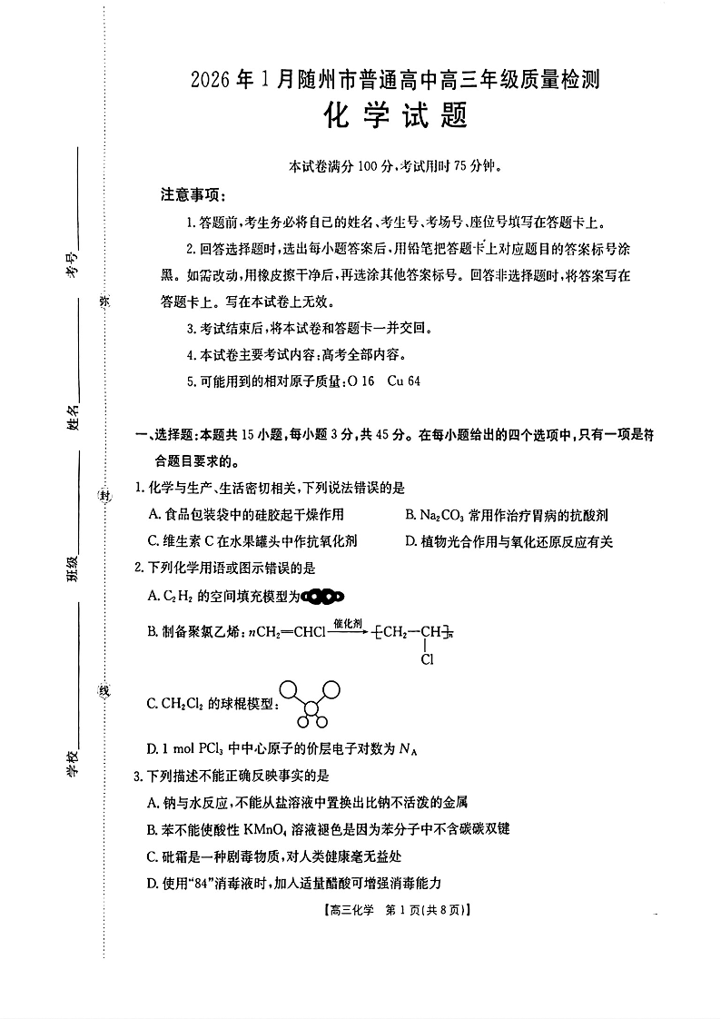 2026年1月随州市普通高中高三年级质量检测 化学.pdf