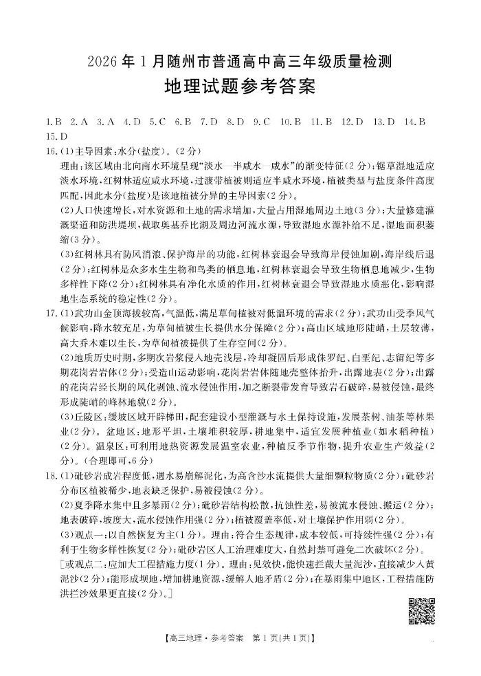 2026年1月随州市普通高中高三年级质量检测 地理答案.pdf