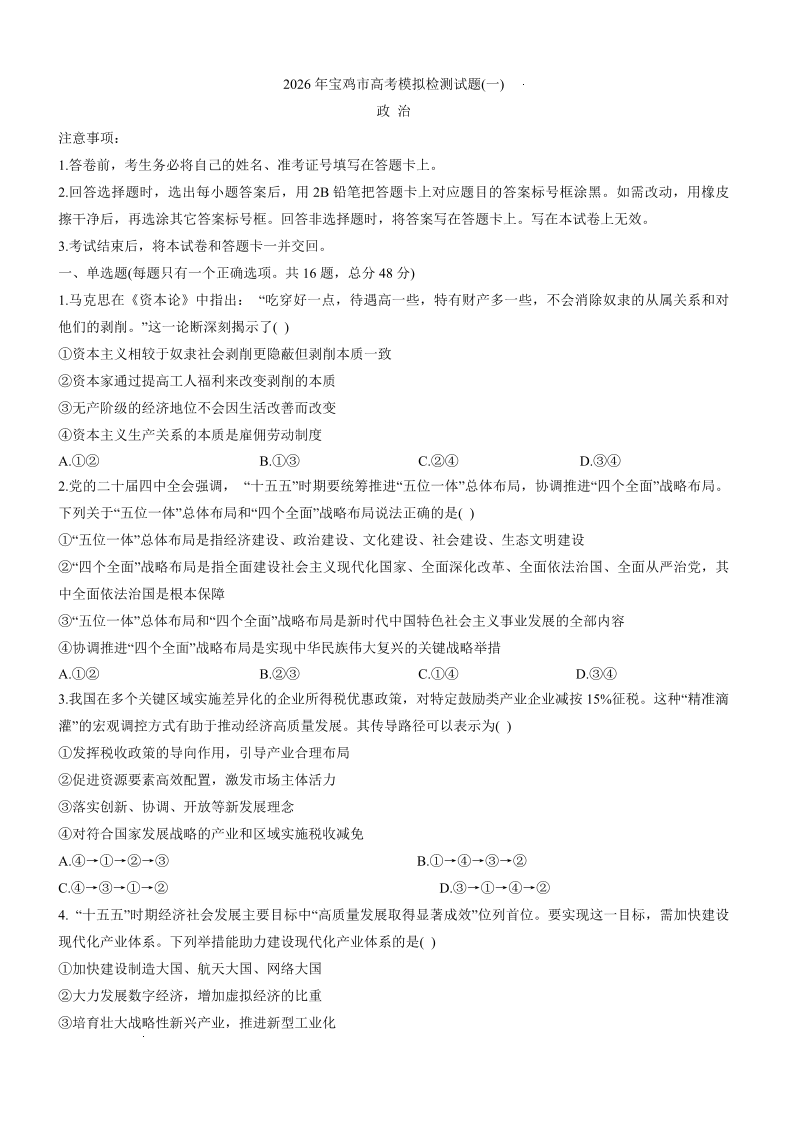 2026年宝鸡市高考模拟检测试题(一)政治.pdf